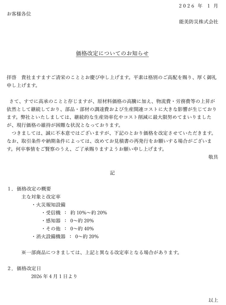 商品価格改定のお知らせ【能美防災】